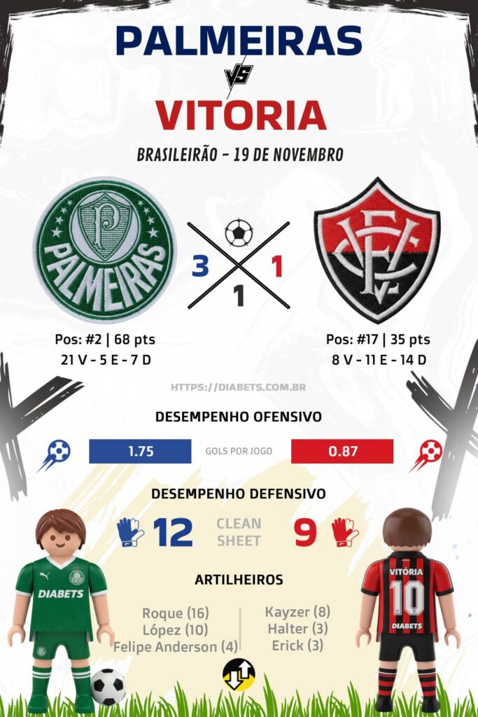 - No Brasileirão: em 26 jogos, Palmeiras venceu 14, empatou 8 e Vitória venceu 4.